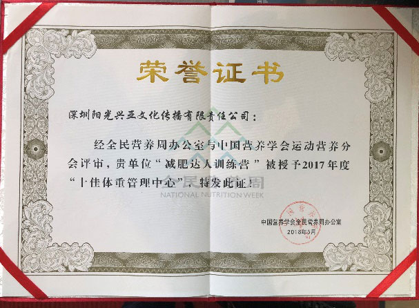 由中国营养学会主办的2018全民营养周学术研讨会暨颁奖典礼在人民日报社举办,《中国肥胖预防与控制蓝皮书》正式发布,中国营养学会发布首届全国“十佳体重管理中心”名单,减肥达人减肥训练营(减肥夏令营)被评为全国“十佳体重管理中心”。