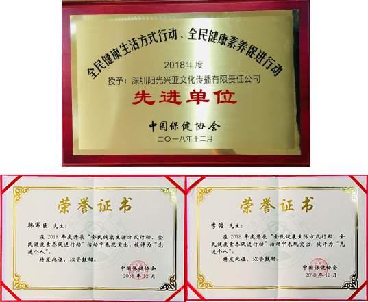 12月3日,由中国保健协会主办的第十八届中国国际保健博览会欢迎及颁奖晚宴在广州举行。深圳阳光兴亚文化传播有限责任公司荣获2018年度“全民健康生活方式行动、全民健康素养促进行动”先进单位,深圳阳光兴亚文化传播有限责任公司韩军臣先生、李浩先生荣获“全民健康素养促进行动、全民健康生活方式行动”先进个人称号。